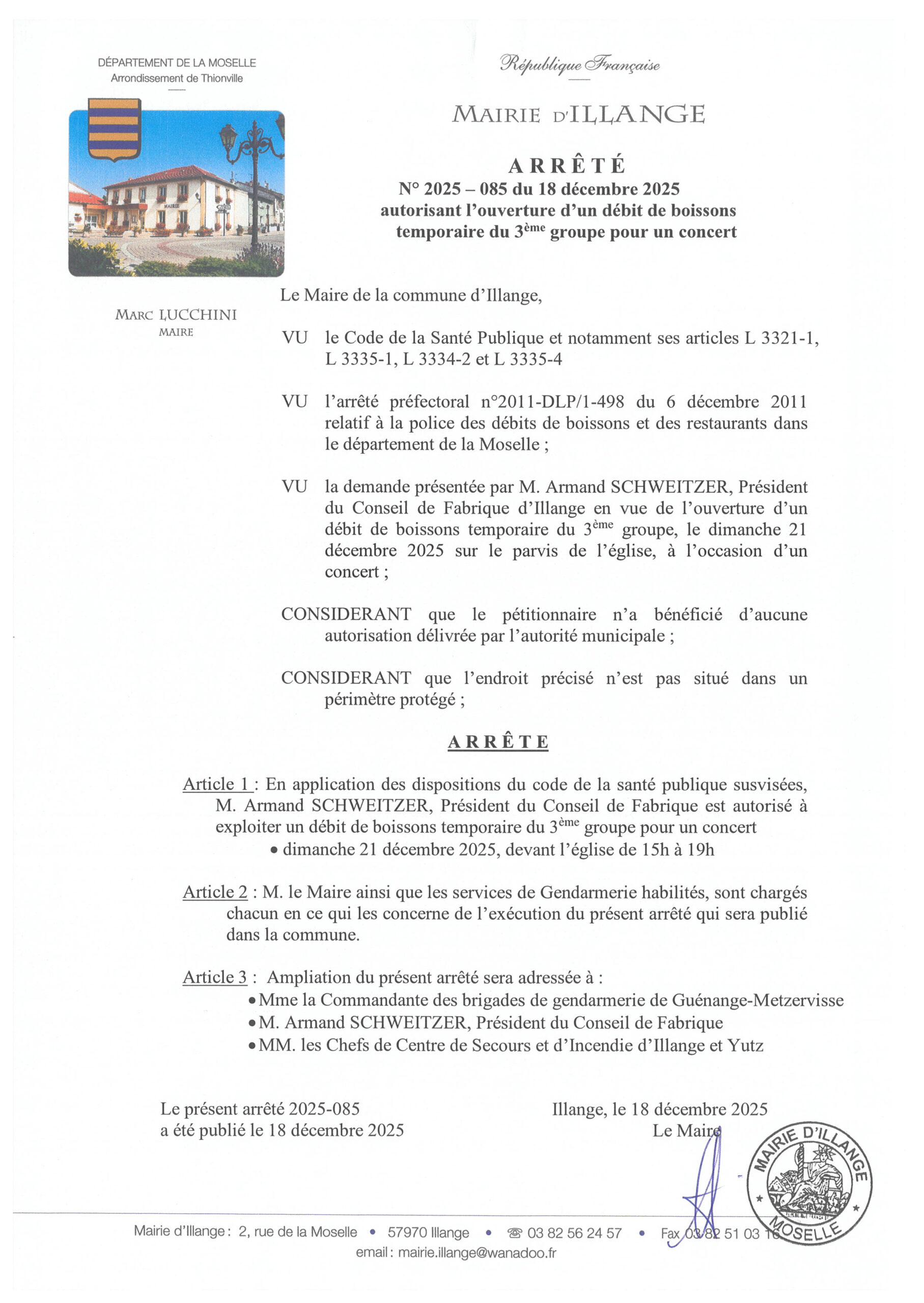 arrêté autorisant un débit de boissons pour un concert le 21 décembre 2025