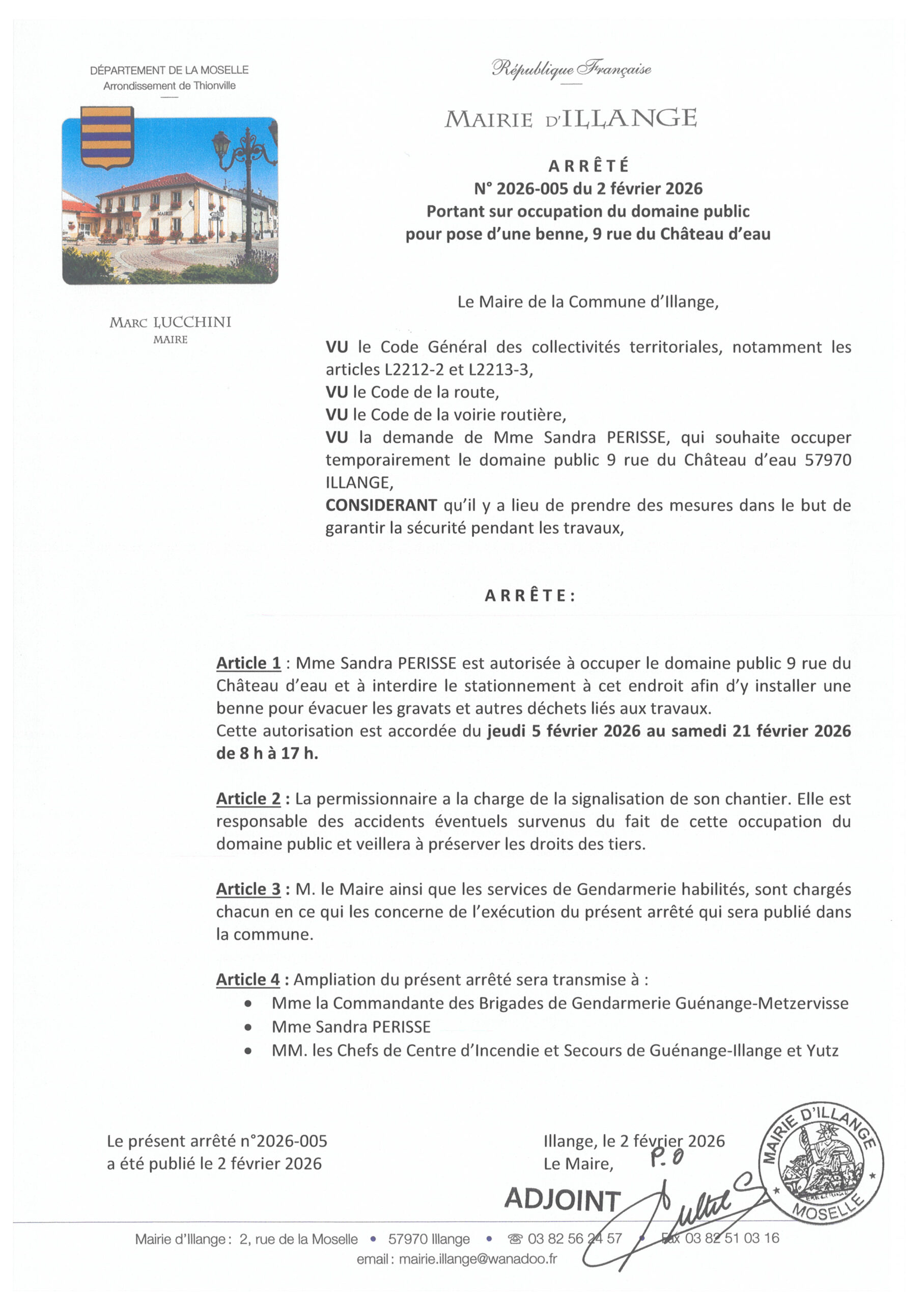 arrêté autorisant une benne 9 rue du château d’eau du 5 au 21 février 2026