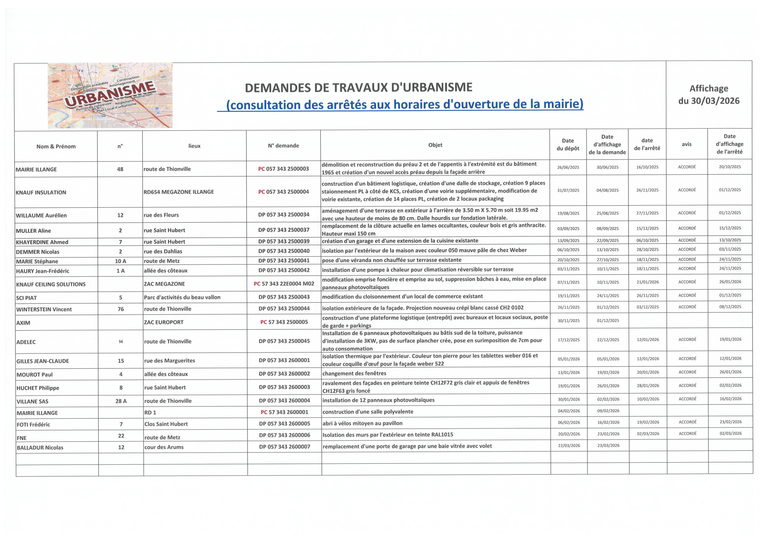 urbanisme au 30 mars 2026